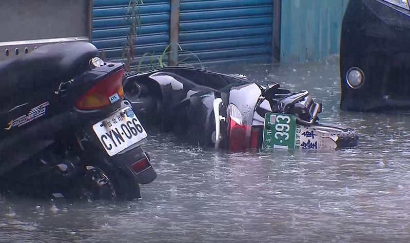 在台北社子延平北路六段,停在路旁的機車,幾乎已經看不到輪胎,另外一台車輛不慎被推倒,整台車只剩約五分之一,還露在水面上。