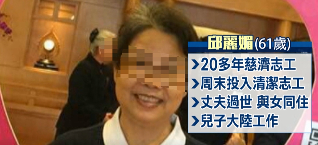 穿著慈濟制服參加活動,另一張照片的她拿著單眼相機捕捉活動細節,61歲的邱麗媚之前是20多年的慈濟志工,常常參與公益活動,也會利用周末和鄰居一起清掃街道,丈夫20年前過世,現在跟女兒同住,兒子則在大陸工作,其他親友聽到噩耗也紛紛趕來桃園協助處理後事。