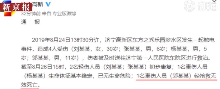綜合外媒報導,該座主題公園的涉水區,於24日下午1時許發生了觸電意外,「造成4人受傷,包括一名30歲女性和3位男童,隨後都被被送往濟寧第一人民醫院東院區進行救治。」送醫之後,6歲男童及劉女都已經沒有大礙,而5歲男童雖身受重傷,但也已脫離險境,不幸的是,11歲男童還是不治。