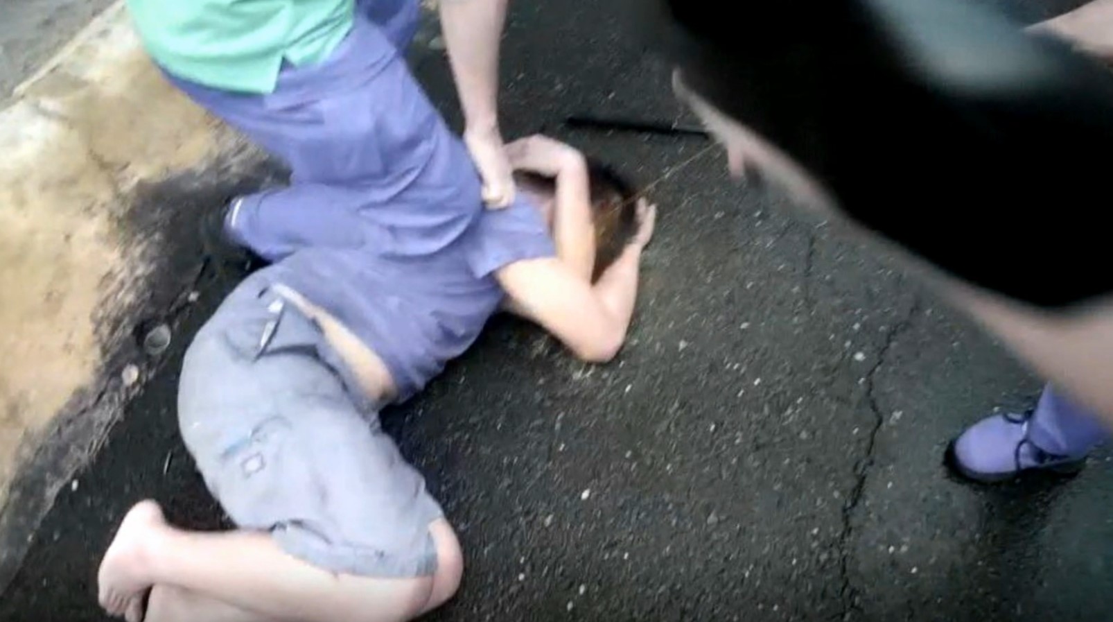 有一位身穿製服的員警,與一名綠衣便衣員警,正在試圖制伏持刀的嫌犯,只見嫌犯不斷揮舞手上的刀子,便衣員警拿出辣椒水,就往嫌犯臉上噴,原本嫌犯還想要反抗,但辣椒水似乎太過嗆辣,於是他轉頭就跑,逃跑過程中不小心滑倒,員警立刻上前將他壓制逮捕。