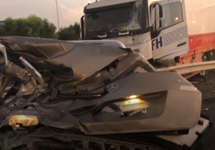 根據國道四隊調查,30日清晨4點52分74歲張姓老翁開賓士車,在南下288.5公里處竟然在路肩倒車,車尾左偏在外側車道,遭後方聯結車追撞,賓士車原地轉了半圈全毀,大貨車則衝破護欄,停在交流道前的匝道,由於正值上班時段,原本4線車道,只剩一半可通行,造成平面車流大塞車。