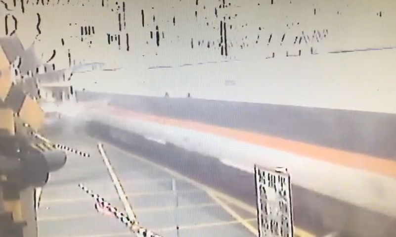 還原事發畫面,一輛寶獅307從中華路平交道巷弄中轉出,停在平交道上等待車流,此時警示聲響起,平交道柵欄放下,車子被卡在當中進退兩難,但54歲的何姓男駕駛卻未第一時間下車,按下緊急按鈕,不到一會兒,慘遭太魯閣號列車撞飛,車體被彈飛一旁,整輛車翻過來卡在鐵路邊。