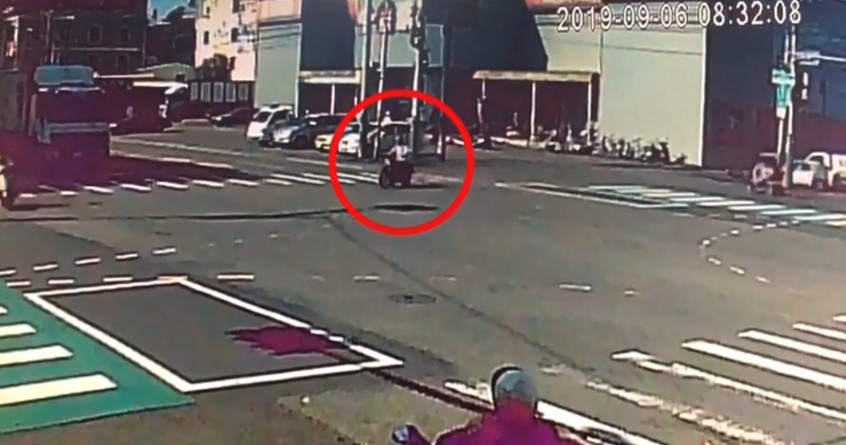 目擊民眾說,老翁這一向變紅燈,橫向車道剛轉綠燈,老翁急著繼續過馬路,視線又被一輛大型車擋住,大車旁的白色自小客,當然也沒看到老翁機車,老翁跌坐在地,附近所有人全看傻眼,幸好老翁坐在地上身體還能動。