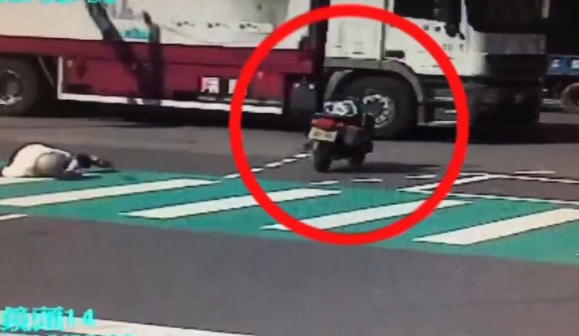 一早將近九點,騎士騎車過馬路,才剛過了一半路口橫向車道就變綠燈,一輛白色自小客直行到路口要轉彎,就這麼不巧和老翁發生擦撞,老翁連人帶車被這麼一撞倒在地上,而他的機車自己在路上,滑行一圈約五、六公尺才停住倒地。