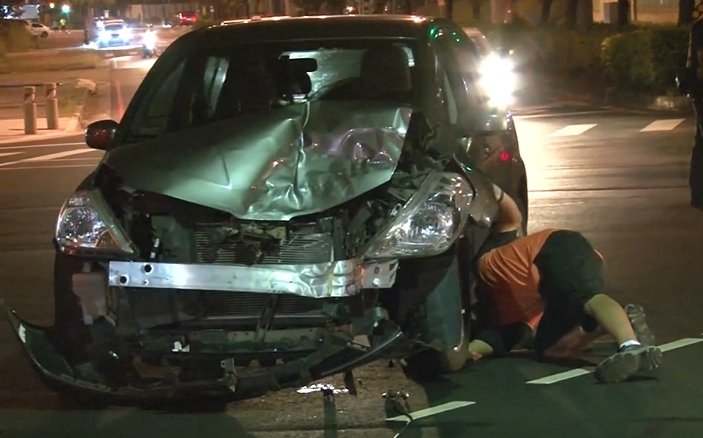深夜,台中發生離奇車禍。一輛正要被拖吊的轎車突然「拖鉤」斷裂,瞬間滑落,車主站在後方直接被撞倒壓在車底,幸好只有擦傷。不過他才剛在路口追撞休旅車,車頭嚴重毀損,本來人沒事,卻在拖吊過程被自己的車撞傷,實在是禍不單行。