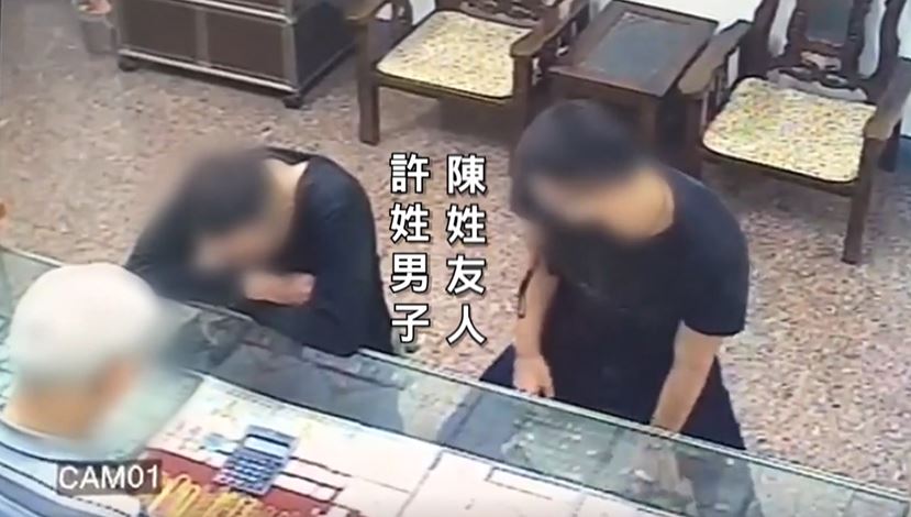 監視器畫面中,許姓男子認真地看著金飾,還有一名陳姓友人也陪同一起挑選,這個月14日許姓主嫌跟陳姓嫌犯先到銀樓探路,聲稱要買結婚金飾套組,大概要25萬元的金飾,但現金沒帶夠,隔天許姓主嫌再度上門,請老闆把金飾拿出來看一看,就請老闆算多少錢,這時它卻把金飾抓了就往門外衝。