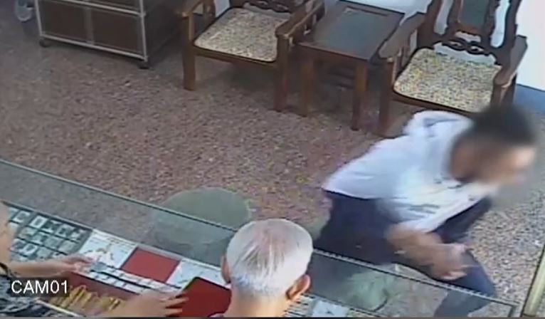 銀樓老闆:「說要買整組結婚用,隔天剩一個來,就說要那一套,還有昨天看的那條金鍊,問說算多少錢,搶了就出去騎摩托車,我太太出去,他要走了把他拉倒。」