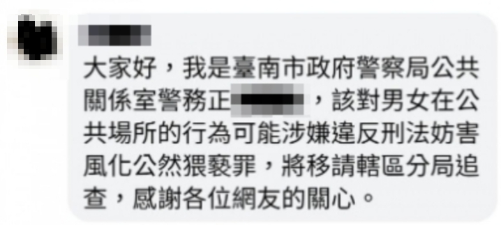 而PO文同時也引起警方注意,隨即提醒「這種行為可能會觸犯妨害風化罪嫌,會請轄區警分局調查」,呼籲網友切勿轉傳相關影像照片,避免觸犯兒少法或是妨害風化刑責,另外,根據《自由時報》報導,雖然影片中的男女並未露全臉,且影像很小,但轄區二分局警方根據民眾提供資料,當天晚上就找到影片中的男主角,訊後依妨害風化罪嫌送辦,同時將追查女主角到案,至於不雅照與影片也已經刪除。