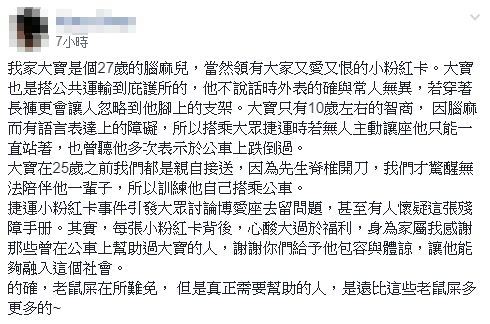 然而,這次的暴力讓坐事件,博愛座去留也鬧得沸揚,不少人直疑粉紅小卡的作用,也讓原PO心酸的寫下,「每張小粉紅卡背後,心酸大過於福利」。她內心相當感激曾經在公車上幫助過兒子的人,也因為這些人的包容讓兒子能夠融入社會。不過她也不諱言,「老鼠屎在所難免」,但真正需要幫助的人,遠多於老鼠屎。