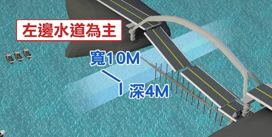 軍方看過設計圖,評估所有可能狀況後,預計將以左側的水道為主,開闢寬十公尺、深四公尺的替代航道,讓港內600艘的漁船進出,選擇用切割而不是爆破的方式,也是考量到受困水裡的漁民的安全性。