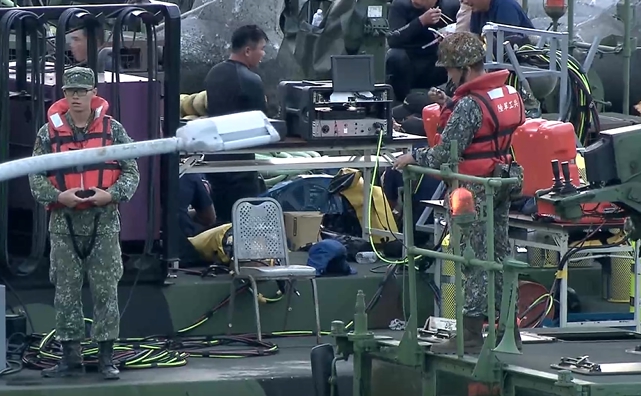 潛水人員整裝完畢準備下水,要仔細探勘水面下的狀況,工程人員也在一旁把堆積在水上的雜物給清除,因為現在大批漁民都在盼著軍方什麼時候能夠排除橋樑以及其他船隻殘骸,提供他們一條出路。