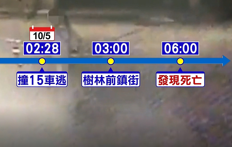 東森新聞記者吳姿儀:「沈姓男子在撞倒這邊一整排12輛的機車之後,往這個方向逃逸,事後警方追查肇事轎車,找到車主,車主說他把轎車借給朋友,但是離奇的是,警方找到這名朋友,竟然倒臥在樹林的一處社區門口,已經明顯死亡。」