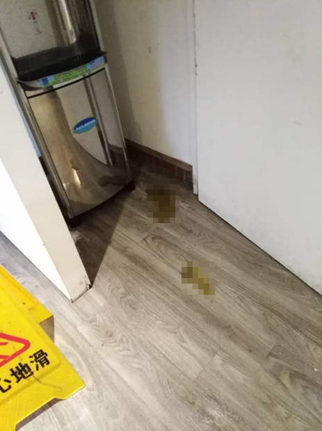 根據原PO貼出的照片,阿伯疑似在門口就捧著屁股,進到室內後隨即蹲在飲水機旁就地解放,絲毫不顧是公共空間,也不怕有人出入,留下2灘青綠色穢物後走人。
