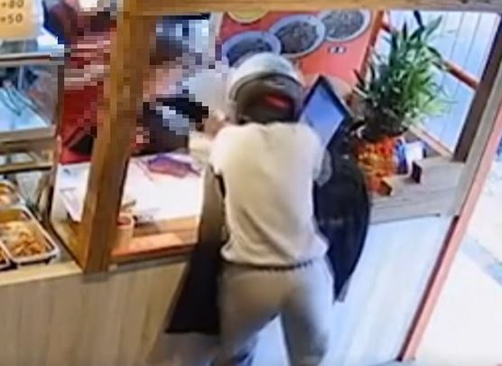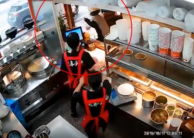 專賣酸辣粉的櫃台人員正低頭找東西,卻遇到了宵小,戴著安全帽的竊賊突然打開收銀機,右手狂抓現金,從最內側拿到最外側,這時候女店員發現不對勁,拼命把收銀機往回推,試圖要闔上去,但竊賊一度不罷手,直到其他員工見狀上前幫忙,小偷這才離開。從另一頭的監視器來看,小偷一開始拿著他的餐點先往室內走過去,疑似看準店員忙碌的時機,快步走到櫃檯前,狂掃鈔票硬幣,隨即逃離現場,但也嚇壞員工們。