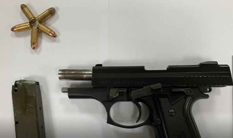 台北市警方16日執行臨檢勤務,發現一名男子行跡詭異,追上前盤查,男子心虛躲進大樓把背包丟地上,被眼尖員警發現,撿起包包打開一看,竟是一把改造手槍、五發子彈,當場人贓俱獲,把人上銬帶走。