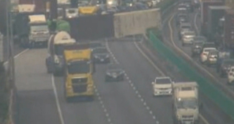 這起車禍發生在國道1號南下324公里處,1部貨櫃車追撞兩輛小客車造成貨櫃車翻覆,由於整台車橫跨3車道,南下交通一度動彈不得,引發嚴重回堵,全線封閉拖吊中。
