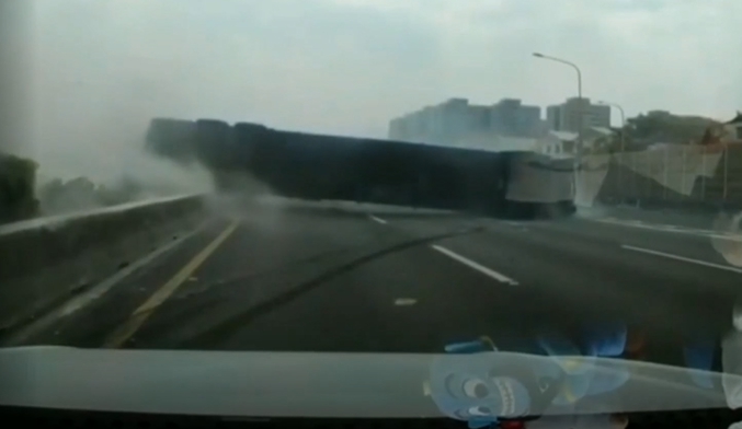 駕駛行駛到一半,前方的大貨車突然靠左擦撞旁邊的車輛,接著整輛車開始打滑,車身撞上分隔島,整輛車傾斜翻覆,橫躺在國道上。