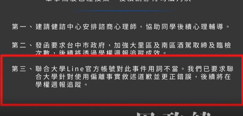 儘管肇事者在警方策動下投案,但事發第一時間,苗栗聯合大學校安中心的官方LINE帳號卻發布這樣的訊息,標題寫著「又是夜遊惹的禍」,底下還附上車禍新聞連結,這則訊息引發眾怒,不只聯合大學學生會看不下去,興大學生會30號也發出聲明,其中第三點要求聯合大學使用偏離事實敘述,必須更正並且道歉。