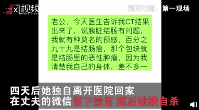 據鳳凰衛視報導,廣東省深圳市48歲的汪姓女子,10月23日獨自前往醫院檢查,4天後出院,回到家中突然傳訊息給老公交代遺言。訊息中她表示,自己的檢查結果出爐,胰臟結腸出了問題,自己有強烈的預感認為,下腹的包塊就是結腸裡面的惡性腫瘤,為了不拖累家庭,所以決定放棄治療。傳完訊息後,便從9樓墜樓輕生,不幸身亡。