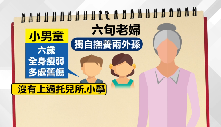 六十幾歲的婦人,女兒再婚後把和前夫生的一對兒女交給婦人撫養,小男孩送到醫院時身上多處舊傷,已經6歲預計明年上小學,沒有上過托兒所,對於孩子身上的傷,外婆說都是孩子自己跌倒。