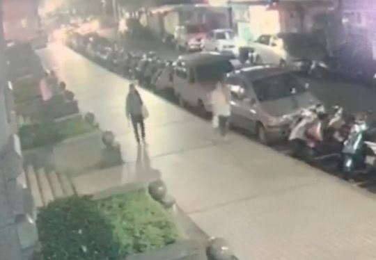 兩名女子 一前一後,只是前方的孕婦,發現被尾隨,加快腳步離開,但後方婦人卻突然,舉起手上瓶子,潑灑不明液體,孕婦嚇了一跳 跌倒在地,迅速爬起小跑步離開。