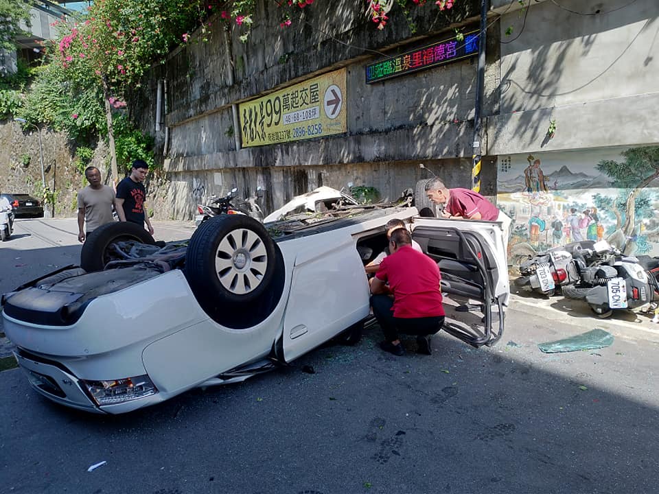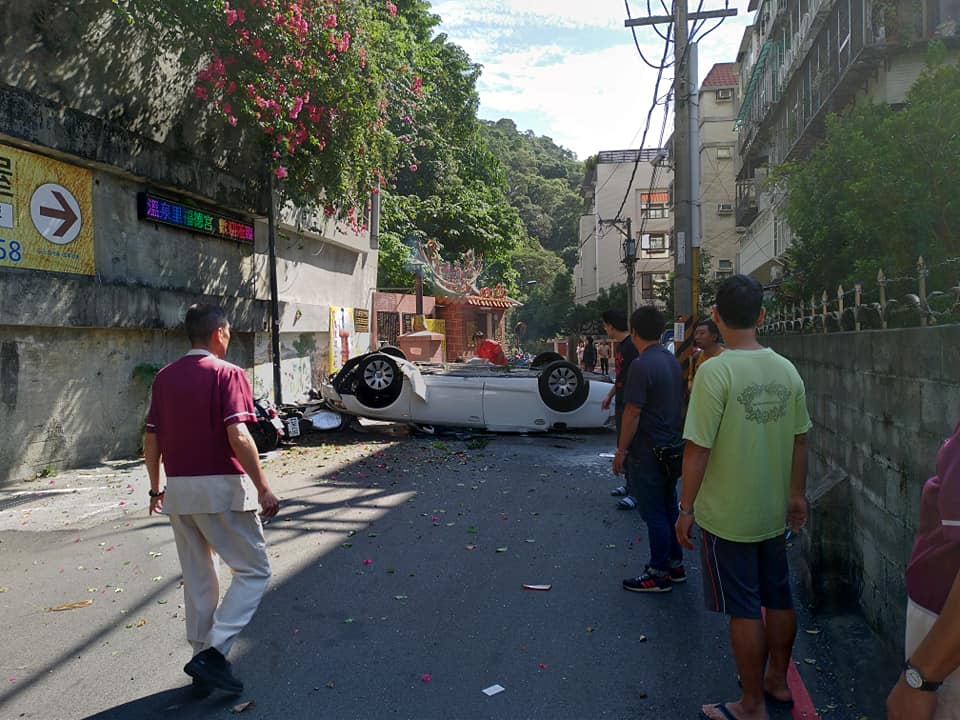 台北市北投奇岩路與溫泉路68巷口,今(7日)中午12點半發生一起詭異車禍,一輛白色的進口轎車翻覆在馬路上,當時駕駛還一度受困,警消獲報到場將這名年約六十歲的駕駛救出,發現他意識模糊,送往榮總醫院急救,但是詭異的是這台車的車頂幾乎全被壓平,目前警方正在釐清事故發生原因。