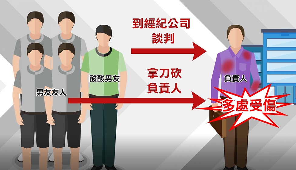 而就在酸酸的男友得知這件事情後,在2018年的8月,酸酸男友就找了4名朋友陪同酸酸到經紀公司談判,沒想到其中一名友人拿出預藏的刀子砍傷經紀公司負責人,導致對方多處受傷,台北地檢署調查後,將酸酸男友與朋友等5人依傷害及重傷害罪起訴,至於酸酸被控殺人未遂的部分,檢察官認為沒有事證證明她教唆砍人,因此不起訴。