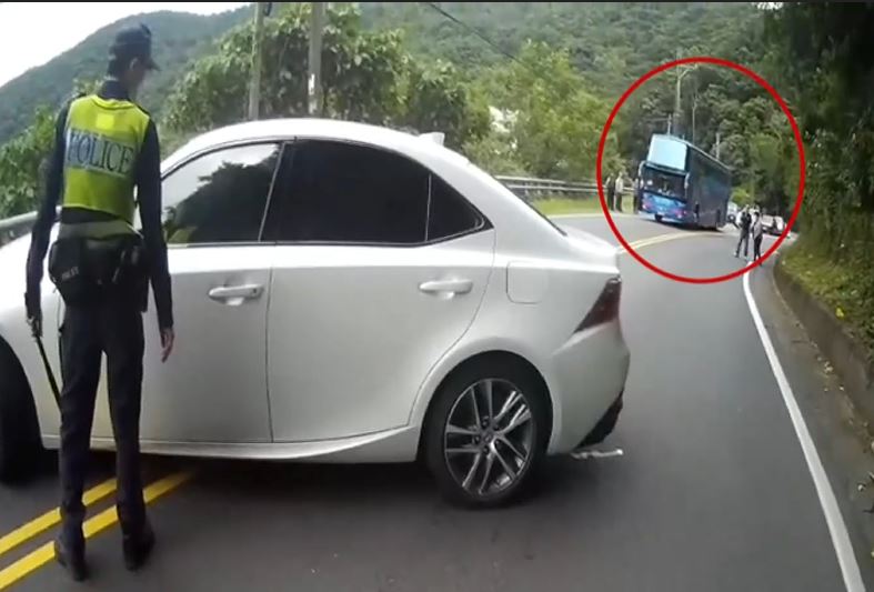 因為開著白色小客車的朱姓駕駛連續違規超車,遭到警方攔下,但朱姓駕駛拒絕受檢,索性將車子直接橫停在路中間,雙向道路也因此被阻斷。