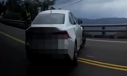 一輛白色小客車整輛車越過雙黃線,7日下午南迴公路發生這起路霸鬧劇。警察:「不要在那邊,阻礙交通啦。」