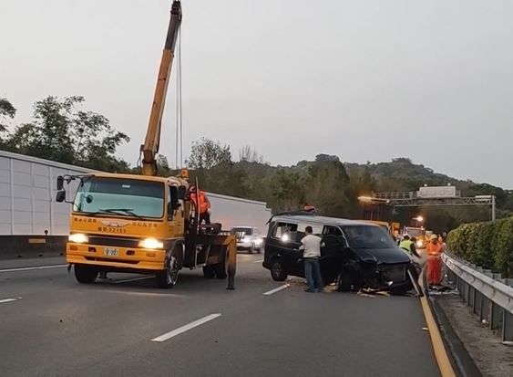 廂型車駕駛右手擦傷,救護人員到場已經初步包紥,駕駛說要去桃園載客人,中線車道出現自小客停住不動,煞車的時候已經來不及。
