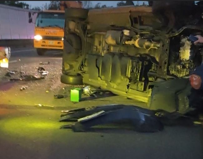 整輛休旅車就快要解體,車廂後門撞得扁到像一張紙,可以想見撞擊力道之大,車禍發生時間凌晨四點多,國道一號中山高北上126公里,現場一共有三輛車撞在一起,除了廂型車,還有自小客車和一輛統聯客運。