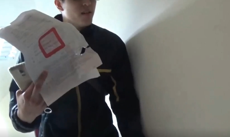 嫌犯雙手上銬倚靠在員警手臂上不斷啜泣道歉,因為他情急之下,竟然把搜索票給撕爛。