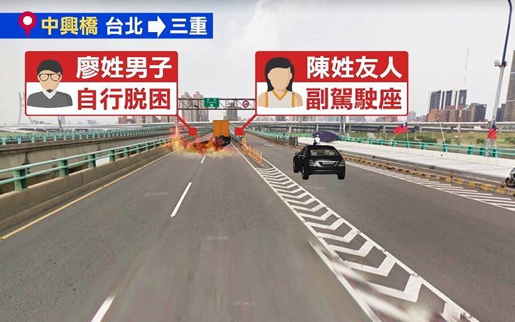 車禍現場情況慘重,車體全被燒得焦黑,警方在現場拉起封鎖線仔細採證,火勢也在30分鐘後順利鋪滅,還原整起事故,當時廖姓男子開車由台北往三重方向開,疑似錯過中正南路閘道,再往右切時撞上一輛賓士車,再衝上分隔島,整輛車往左翻覆,也往前噴飛道前方貨車,隨後就瞬間起火,廖姓男子自行脫困,但副駕駛座上的陳姓女友人,卻被壓在車底,活活燒死。