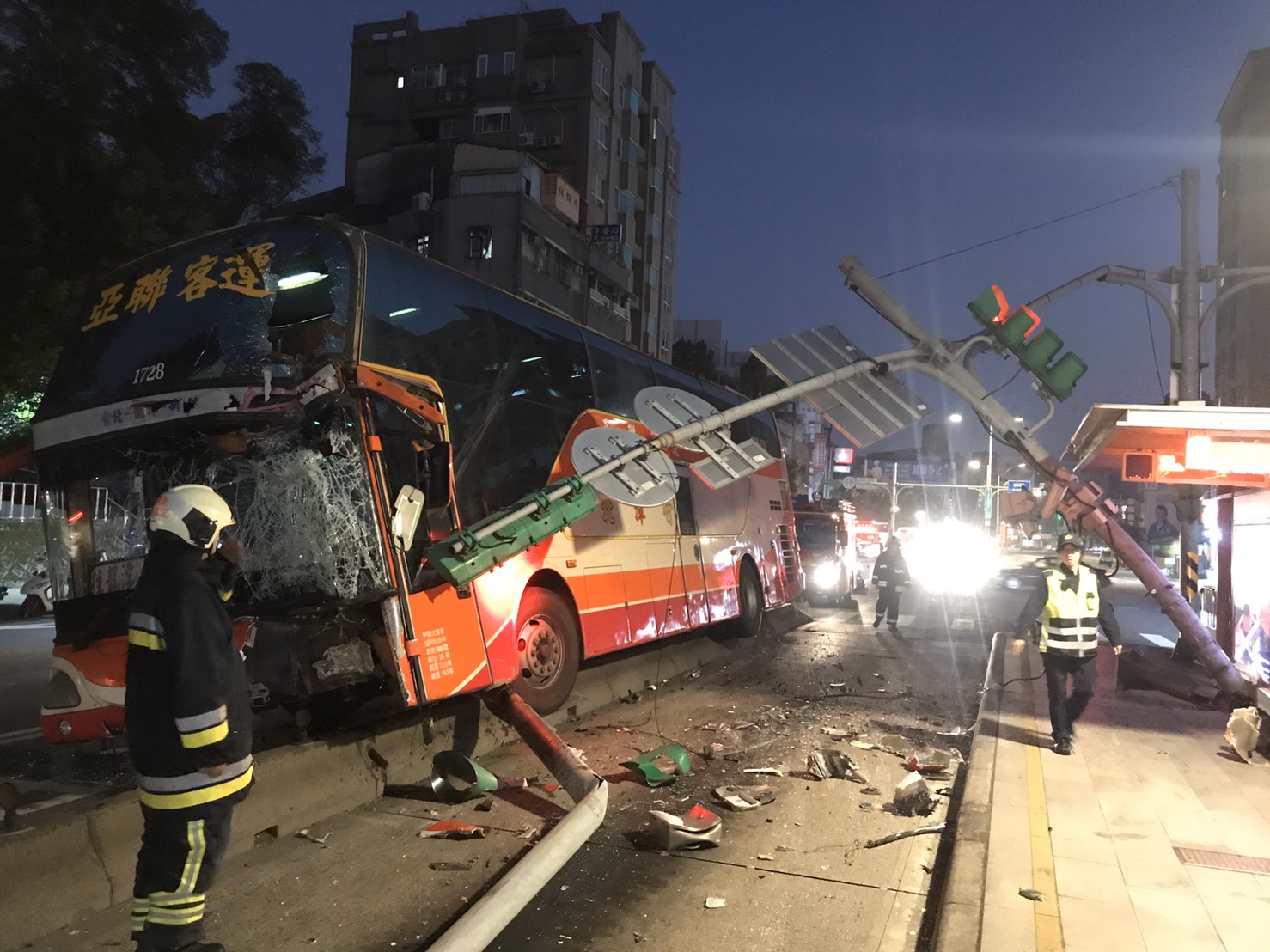 最新消息,稍早五點多在台北市羅斯福路跟萬盛街口,一輛客運巴士的駕駛疑似恍神,導致整台客運撞上分隔島,甚至連路口的號誌燈桿都被撞倒,駕駛一度被卡在車內,警消到場之後先疏散車上乘客,並且協助駕駛脫困,而這名駕駛被救出來之後,腿部骨折,被送往萬芳醫院進行救治,現場還在排除事故當中。
