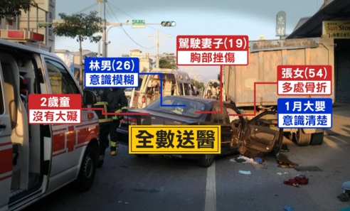 除了駕駛意識模糊,副駕駛座,54歲的媽媽也多處骨折,她手裡抱著一個月大男嬰 則是意識清楚,後座的駕駛妻子胸部挫傷,2歲大女童沒有大礙,但車內五人全部送醫。