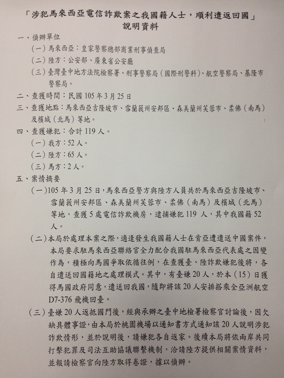 案的52名台灣人,今天傍晚在外交部與馬來西亞溝通之下,馬國先讓20名台灣人搭傍晚的飛機返台,不過,由於「欠缺具體事實」,因此警方登記完身分、資料後,只能直接在機場放人。