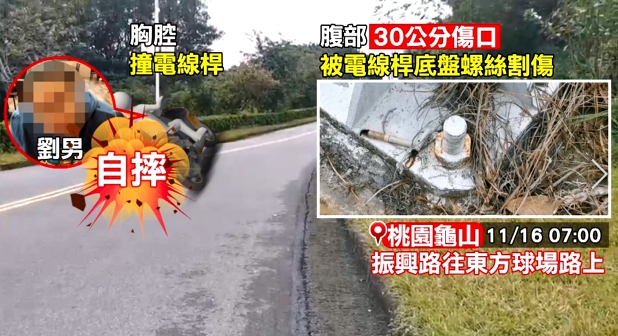 桃園龜山一名劉先生16日早上騎機車,疑似自摔撞上電線桿,腹部被螺絲割傷,傷重不治,家屬認為路那麼寬,應該不會去擦撞到路緣,且報案人報警後就連絡不到了,疑點重重,因為周圍沒監視器,家屬將事件po上臉書,想找尋目擊民眾提供證詞或影片,好釐清死者真正死因。