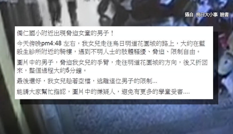 時間是26日下午四點多,女童才剛放學正要走路回家,遇到這名陌生男子突然拉著她的手,讓她受到驚嚇,而她的爸爸也立刻PO網,說女兒遭到肢體騷擾、脅迫,要大家幫忙指認這名男子究竟是誰,引起附近居民恐慌,警方跟校方立刻啟動危機處理機制。