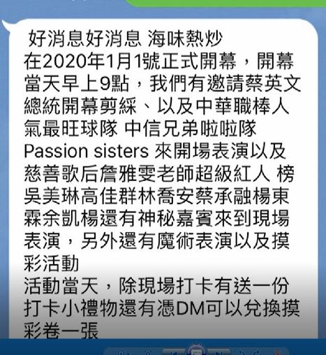 對方自製宣傳海報,上頭印上主持人,歌手詹雅雯等人照片,還有活動流程,甚至準備好菜單、VIP券、開幕邀請卡、工作證,還說要製作工作服。