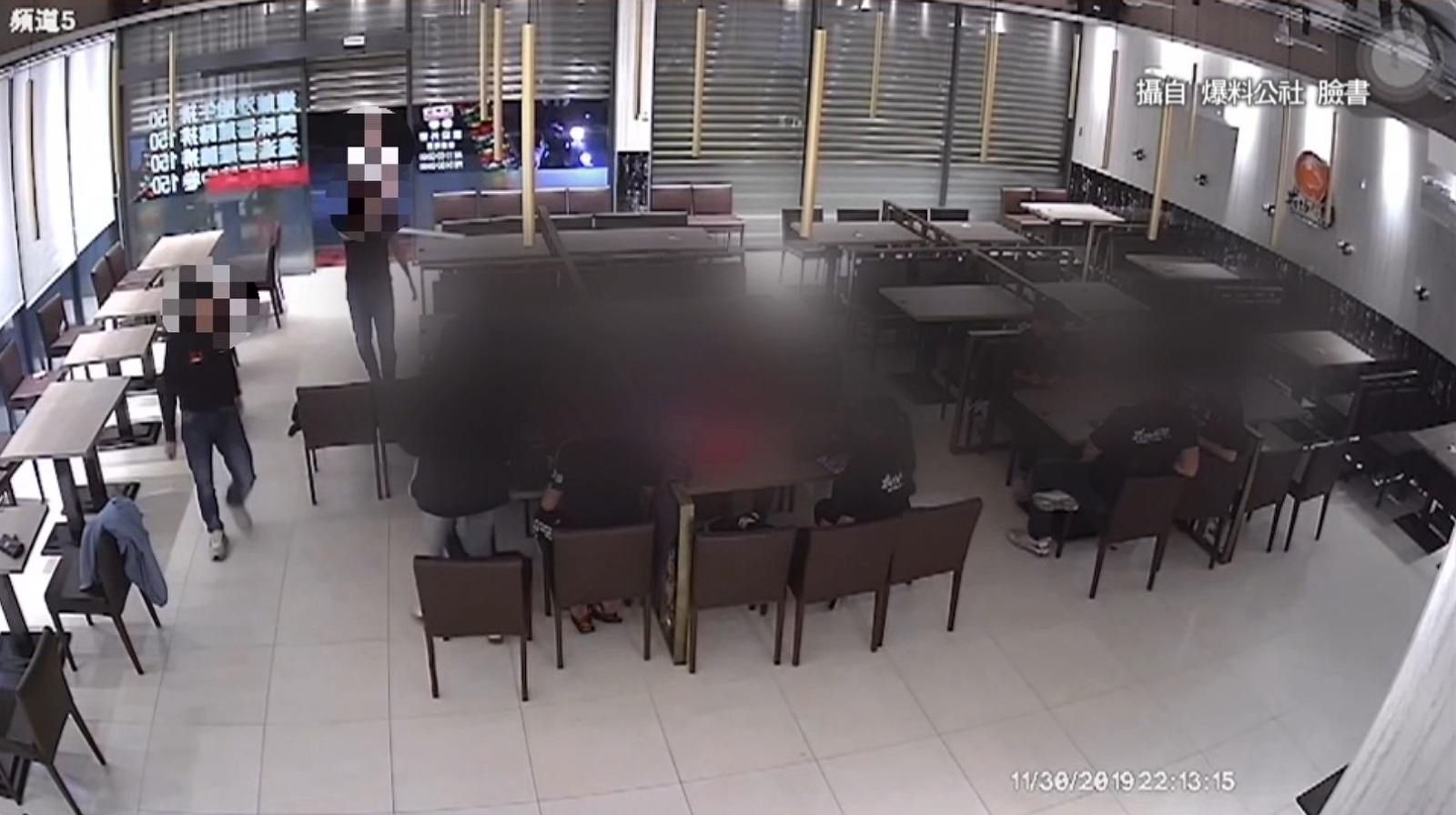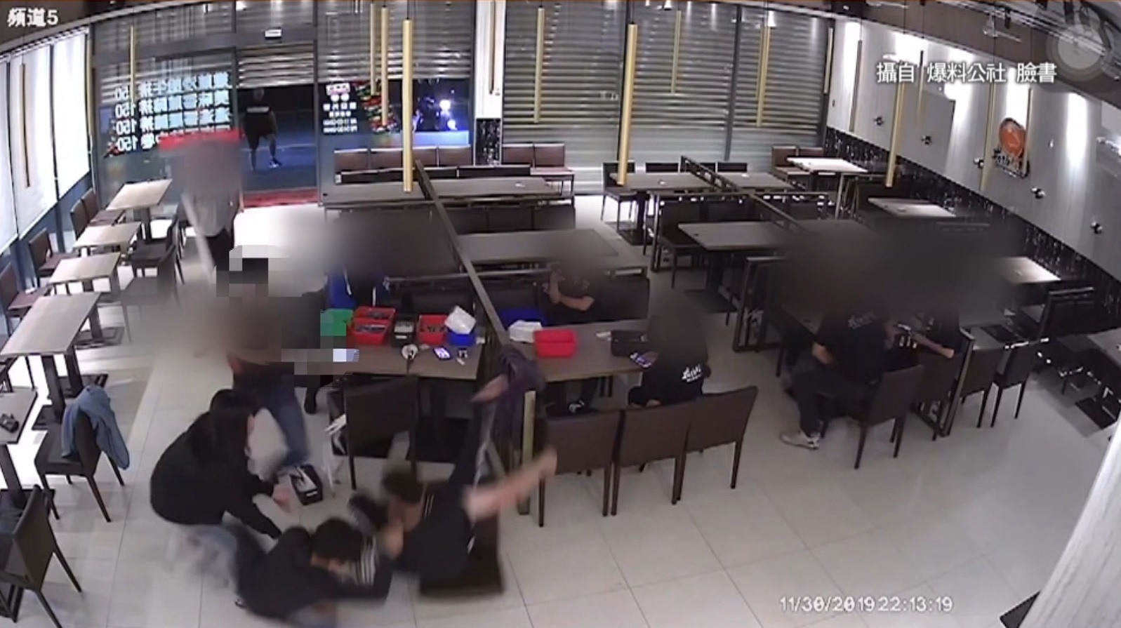 嘉義這間牛排館的監視畫面,看到打烊時間,員工坐在餐桌邊討論事情,店門半開的狀態下,突然闖進一群,將近十人的黑衣男子,領頭的男子手持長棍,威脅其他人不准動,另一人衝上前把坐在,椅子上的男子拉倒,和持長棍的男子,二人聯手痛毆被害人,其他店員想阻止,持長棍的男子再次上前,恐嚇對方不許動,回頭和另二名持長棍的男子,三人持長棍痛毆被害人,打得被害人鮮血沾滿地板,被害人的女友這時出面阻擋,對方臨走前,還踹了被害人一腳才離開。