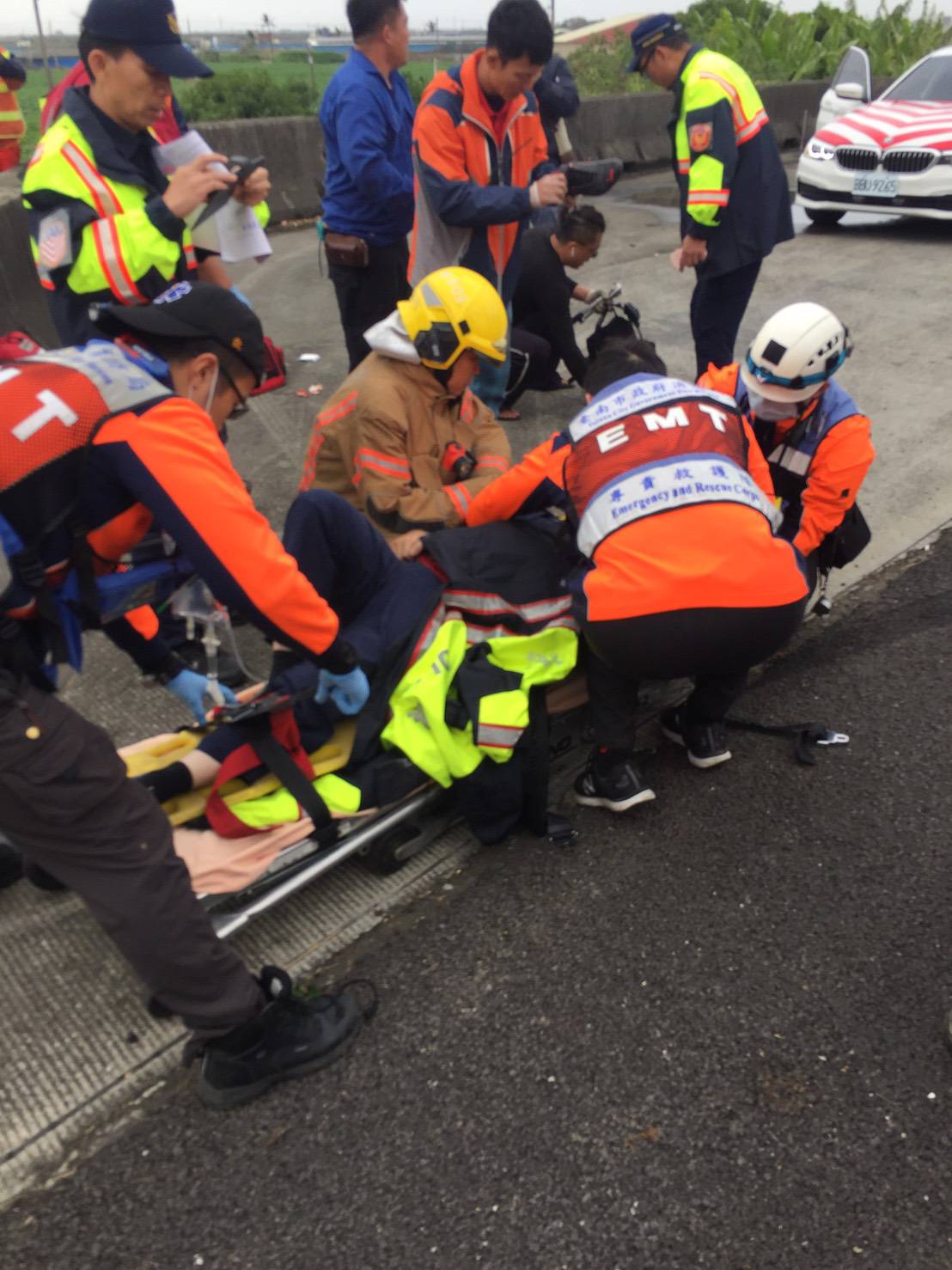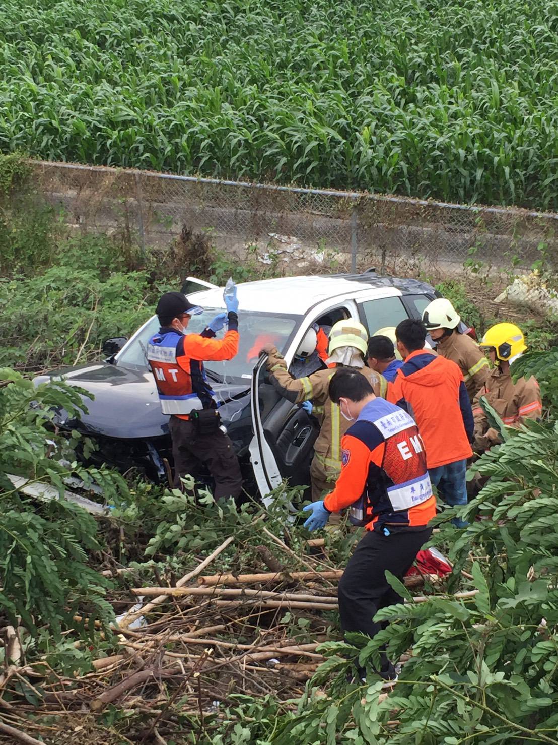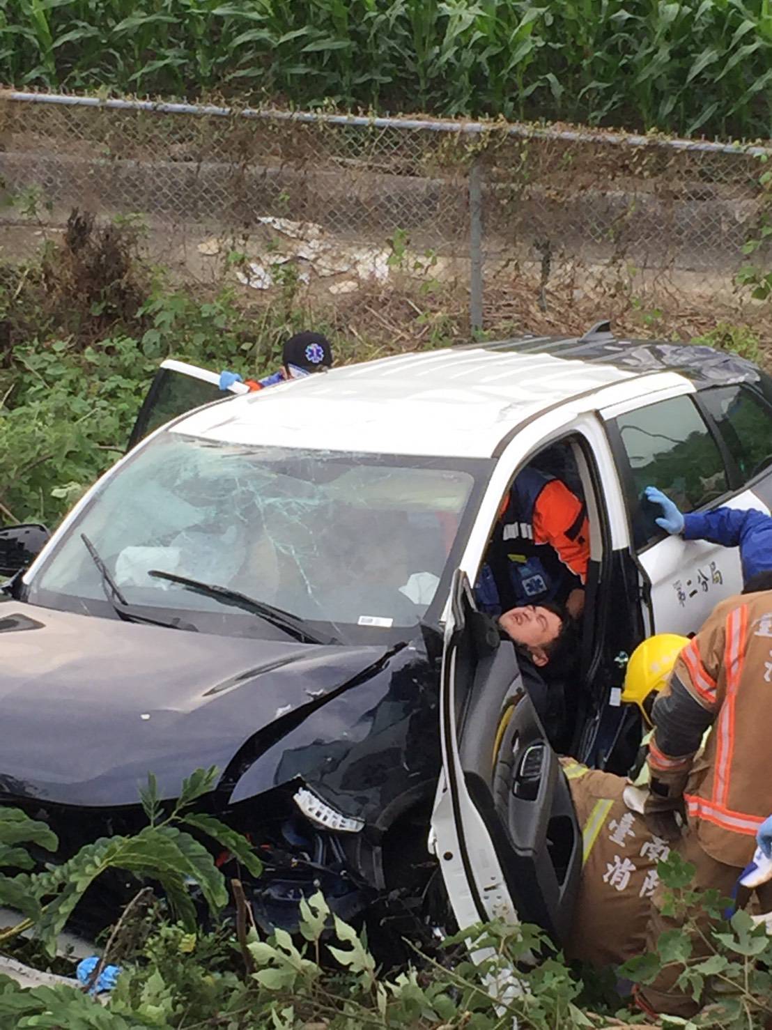 國道1號南下297公里處,今(7日)下午發生一起警車翻覆邊坡的意外,消防局接獲通報後,立即派遣新營及鹽水消防分隊前往協助脫困,當時車上有2名員警和1名人犯,一共3人受傷,所幸全都意識清楚,目前已送往麻豆新樓醫院急救。據了解該輛警車為台中市二分局所有,事發原因正在進一步調查中。