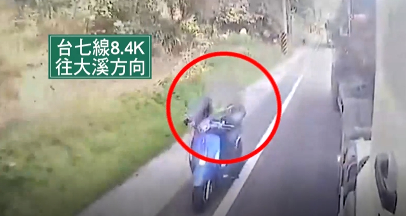 戴著白色安全帽的騎士行經台七線往大溪方向,跟曳引車並行騎車,從行車紀錄器可以看到,男騎士過彎後,原本已經看不到他的人,就快要超越曳引車時,疑似在車頭處發生擦撞,人噴飛往後摔倒,大車後車輪不慎輾壓倒地的騎士,後方車輛見狀紛紛停下車,就怕發生二次追撞,警消獲報立刻到場,發現他臀部以下斷肢,意識陷入昏迷,立刻幫他止血包紮,戴上頸圈、面罩送醫搶救,騎士的藍色機車還卡在35噸重的曳引車車頭處,幾乎輾過一半。