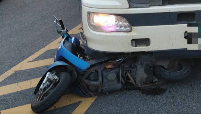 ▼機車騎士跟曳引車併行,疑似在過彎處發生擦撞。(圖/東森新聞)