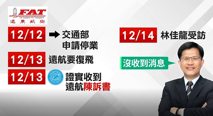 交通部長林佳龍:「他們(遠航)必須提出陳述意見,在18號之前,那根據這個陳述,我們民航局會再做進一步的判斷。」