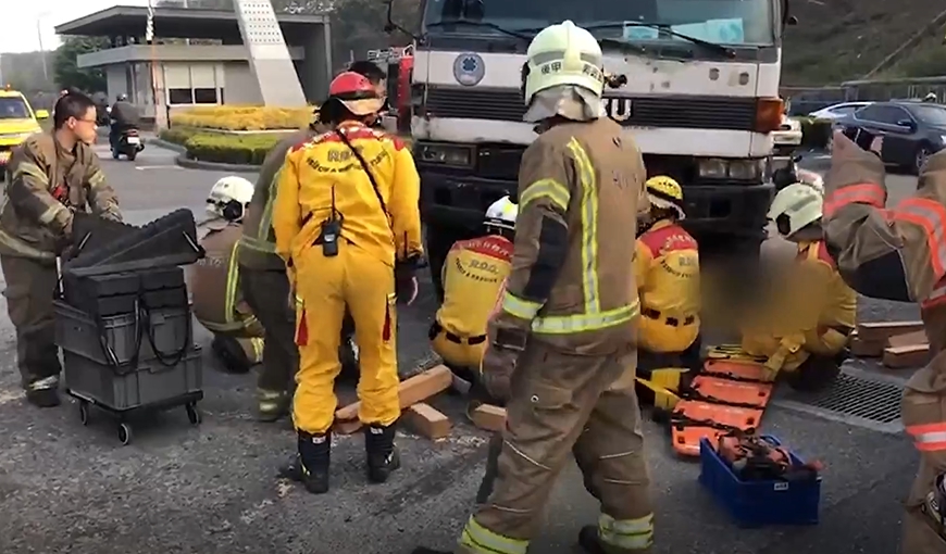 男騎士被壓在水泥預拌車底下動彈不得,口吐鮮血,肚子被車輪壓住,消防人員趕到,趕緊找來千斤頂。