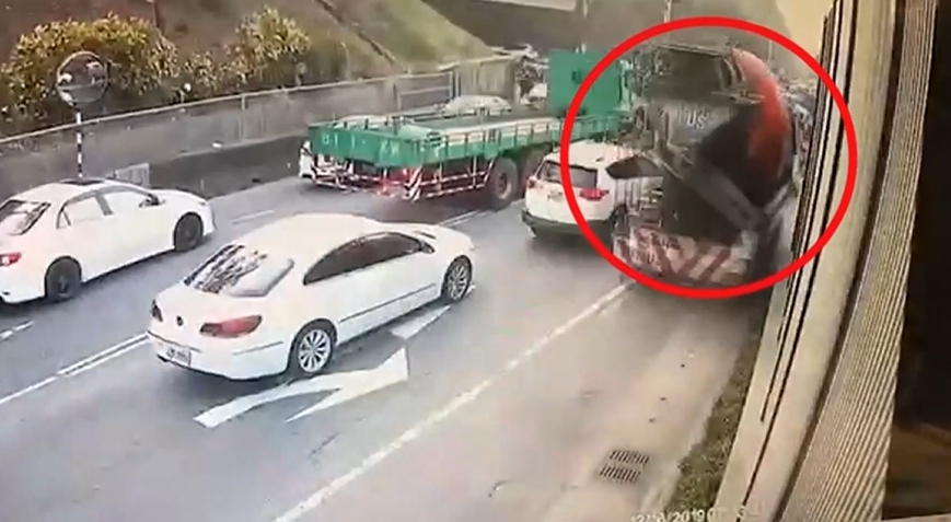肇事的水泥預拌車,當時開往這個路口發現剎車失靈,撞到一輛白色自小客車和兩輛機車後,開往路肩想要閃開汽車,但它的車速不慢,一路往路肩衝,再撞上停等紅燈的四輛機車。