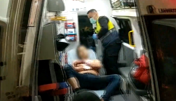被砍的28歲翁姓男子被送上救護車,準備送醫急救,只見他赤裸上身,全身傷痕累累,一見媒體鏡頭,還比出不雅手勢。