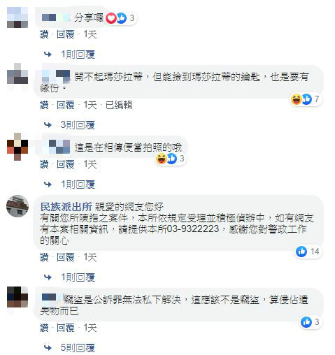 車主的家人表示,已報竊盜處理,願私下解決,請當事人出面歸還鑰匙。針對此案,民族派出所也留言表示,本所依規定受理並積極偵辦中,如有網友有本案相關資訊,請提供給警方。