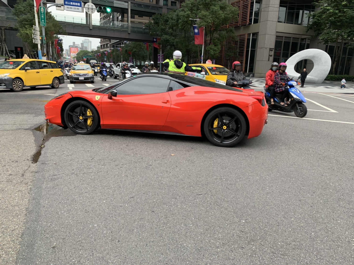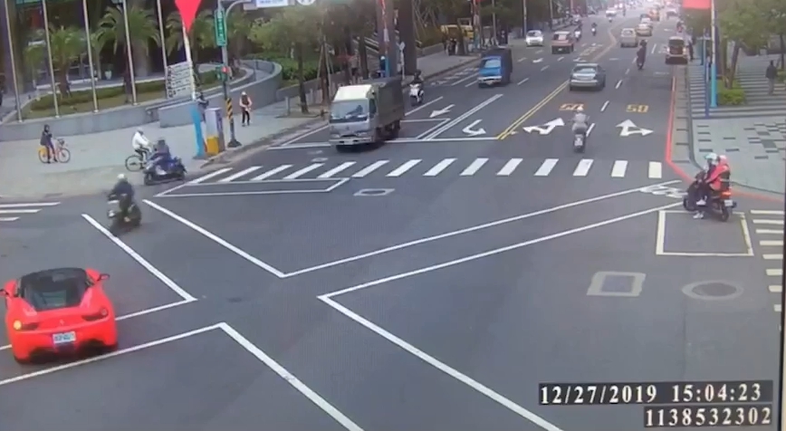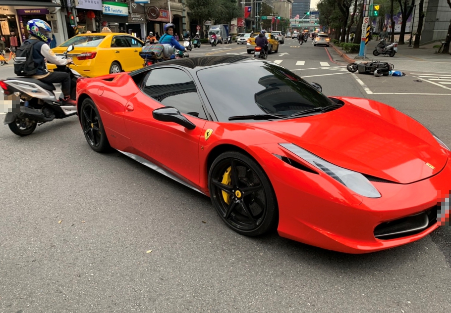新北市板橋市府特區,今(27)日下午發生一起車禍意外,一輛法拉利轎車在路口要左轉的時候,疑似因為視線死角,沒有禮讓對向的直行機車,就直接撞了上去,導致劉姓騎士倒地,身上有多處擦傷,警方趕到現場,對法拉利駕駛王姓女子進行酒測,發現沒有酒駕,相關的肇事責任,後續還有待釐清。