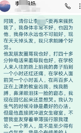 此外,黎白28日下午也曾向男友母親發送訊息,「阿姨,請你讓李XX不要再來騷擾我了,我身體非常不好,也因為他,我身體永遠也不可能好,現在天天掉頭發,我只求能睡個好覺。」最後傷心欲絕地選擇畫下生命的句點。
